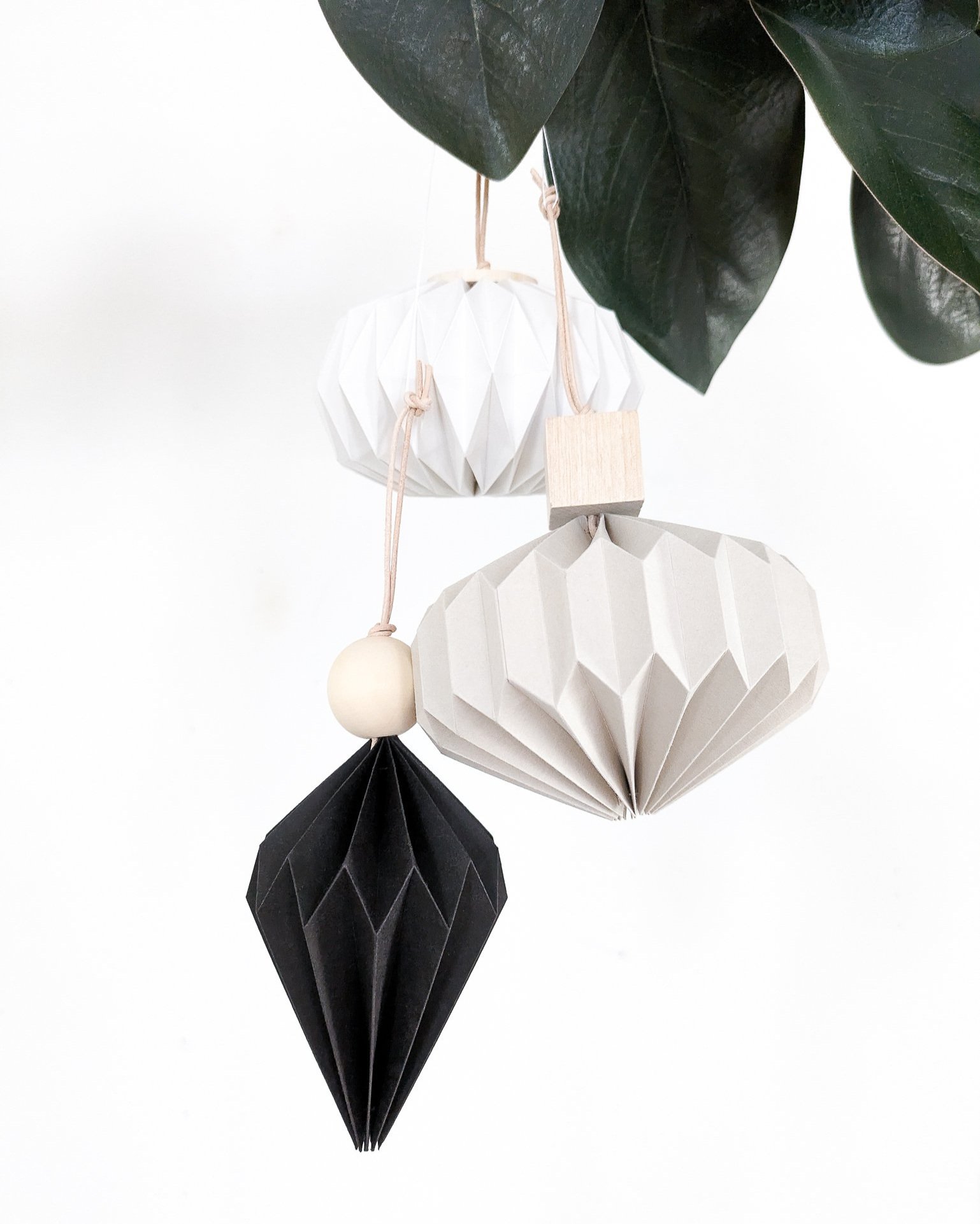 Hand-folded paper and wood ornaments. Each ornament is a different shape and includes a leather hanging loop.